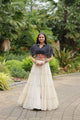 A Designer Readymade Off-White Cotton Lehenga paired with a striking black leheriya Kurti. Perfect for festive gatherings and traditional events, this ensemble brings a contemporary twist to classic ethnic wear.
